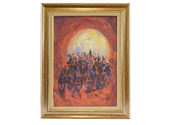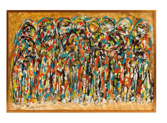Ahmed Cherkaoui, né en 1934 à Boujad, est l’un des pionniers de la peinture moderne marocaine. Il débute par la calligraphie et s’intéresse aux arts traditionnels avant de poursuivre ses études à Paris, à l’École des Métiers d’Art. Diplômé en 1959, il commence par des travaux graphiques et expose ses premières toiles en 1960 à Rabat, où il se fait rapidement remarquer pour son style original, mêlant influences marocaines et modernité européenne.